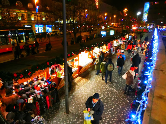 Anděl Christmas Market就是在馬路旁邊,攤位沿著馬路設置,賣的東西比較道地一點,是一個當地人會來逛的地方,因為旁邊就是Anděl的地鐵站,還有大型購物商場,所以也是個熱鬧的地段。