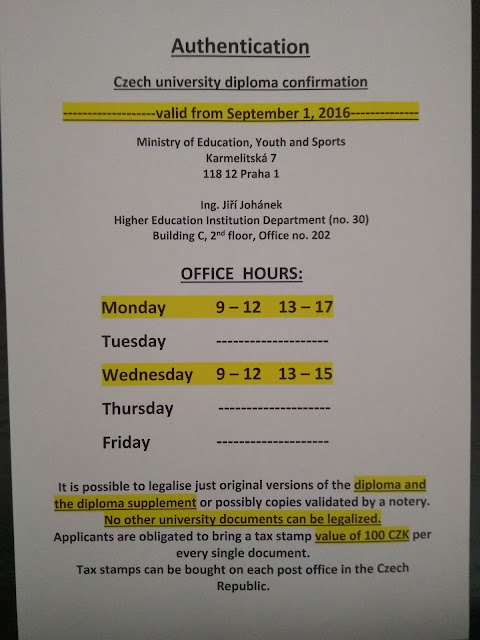 帶著需要認證的所有文件到捷克教育部(MSMT)蓋章,注意他開放的時間,認證文件的開放時間只有每個禮拜一和三的早上或下午時間,如圖